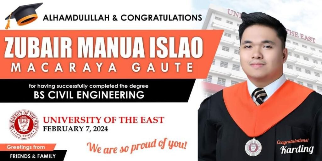 He will graduate from the University of the East with the degree of Bachelor of Science in Civil Engineering this coming February 7, 2024.